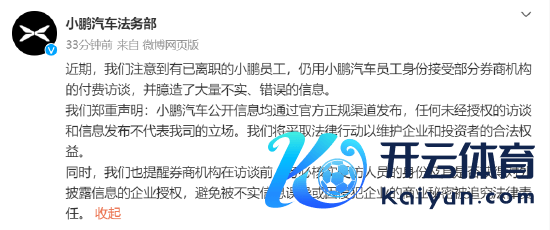 12月2日音书,小鹏汽车法务部发布微博暗示,近期,有已去职的小鹏职工,仍用小鹏汽车职工身份领受部分券商机构的付费访谈,并造谣了无数不实、不实的信息。并声明小鹏汽车公开信息均通过官清廉规渠谈发布,任何未经授权的访谈和信息发布不代表公司态度。