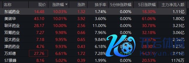 生物制药方面,好意思诺华10.01%涨停,终了7天6板。另外,东诚药业、联环药业、双鹭药业、亚太药业、津药药业涨停。