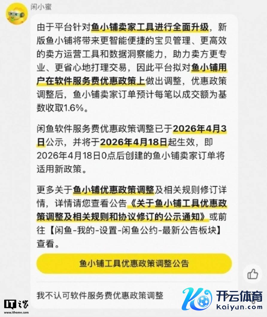 3、闲鱼“鱼小铺”4 月 18 日起退换优惠章程:软件就业费从 0.6% 升至 1.6%闲鱼告示自 4 月 18 日 0 点起,对“鱼小铺”卖家的软件就业费从 0.6% 大幅晋升至 1.6%。这意味着使用该用具的卖家每笔订单成本将显贵增多,且不再享受原有的门槛优惠政策。平台称此举是为配合鱼小铺用具全面升级。卖家需属意相关章程变化。>> 稽查细目
