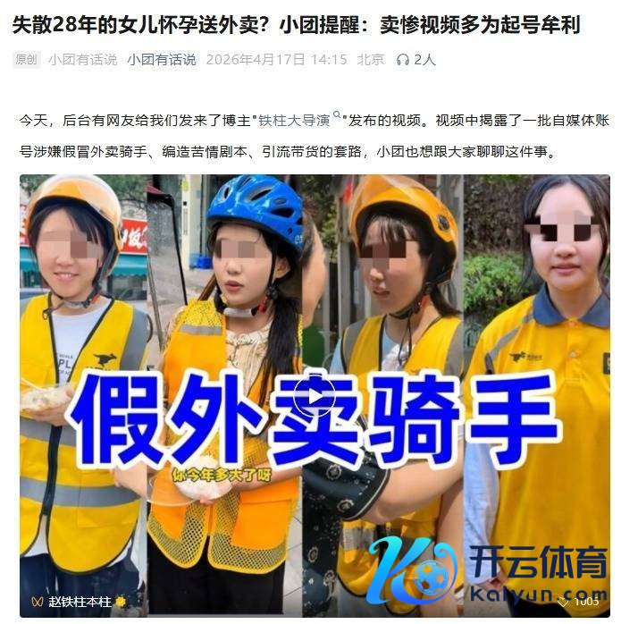 5、失踪 28 年的犬子怀胎送外卖?好意思团指示:卖惨视频多为起号谋利近日,多个短视频平台出现“寻找失踪犬子的外卖员”、“丈夫断送妻子怀胎送外卖”等苦情估量剧,激发普遍存眷。好意思团官方核实,相关账号实质均为失实摆拍,旨在诳骗流量进而谋利。声明揭露了从臆造东谈主设到引流变现的灰色产业链。>> 稽查细目