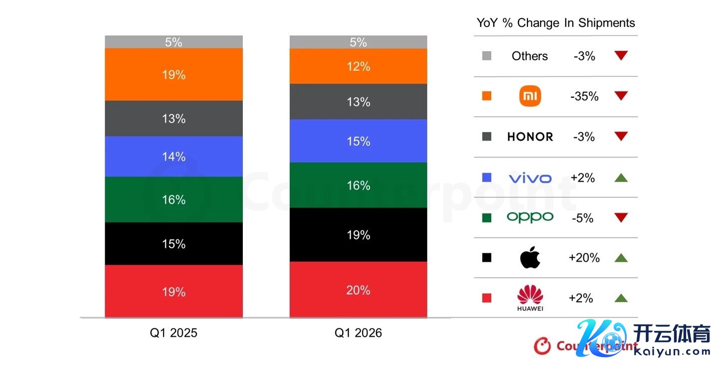 11、CounterPoint 论说 2026Q1 中国手机出货量:华为增 2%、苹果增 20%、OPPO 降 5%、vivo 增 2%、荣耀降 3%、小米降 35%商场拜谒机构 CounterPoint Research 4 月 17 日发布博文,论说称由于国补政策带来的高基期数据,以及内存等组件成本飞腾,2026 年第 1 季度中国智高东谈主机商场出货量同比下落 4%。>> 稽查细目